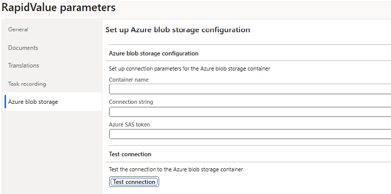 The old storage is replaced with an external one, to provide control over the URL lifespan and image availability. The new image storage relies on Azure blob storage. The details of the storage can be configured in the Azure blob storage tab of the RapidValue parameters. The container name and the connection string are used when uploading the image to the storage, while the SAS token is used to create a valid URL that allows for the image to be rendered within RV.