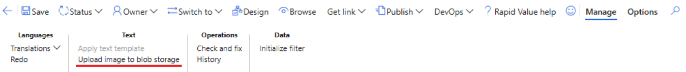 The uploads are handled via the Upload image to blob storage menu item. The upload form with provide a resource URL that can be used within the HTLM editor of the RV elements.