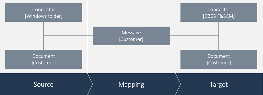 With this concept, all integrations are set up in the same structured way. You can also reuse components. For example, if you want to export customers from D365 F&SCM to the webshop, only a new message is required, and you can reuse the connectors and documents.