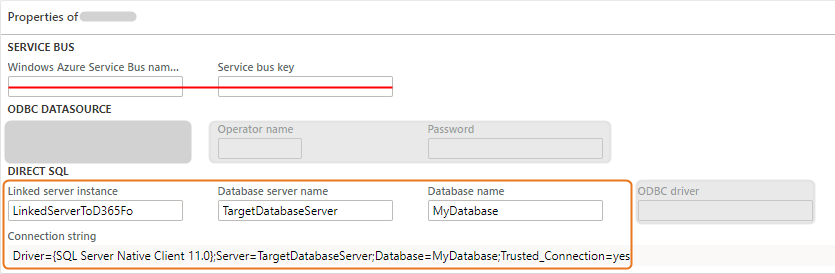 If you use direct SQL, you connect using the driver. By default, the 'SQL Server Native Client 11.0' ODBC driver is used. Optionally, you can define another, ODBC driver. Example: 'ODBC Driver 13 for SQL Server'. |