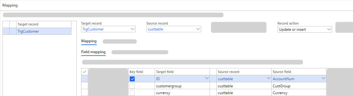 - Target mapping: On the Field mapping, in the Source record field, on the lookup, you can change the Direction to Target to create a target mapping. For direct SQL, this is not supported in the execution of the message.