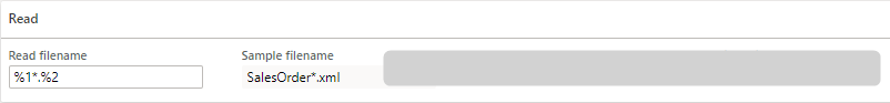 - Document header, in the Read file name field, define a range value. For example, use an asterisk (*). Example: Read file name = %1*.%2 and Sample file name = SalesOrder*.xml.