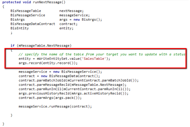 BisMessageRunDirectInsert | You can use this handler class if the message type is SQL. It gets the data from the D365 F&SCM database and directly enters it into the external database. It only inserts the records in the external database. |