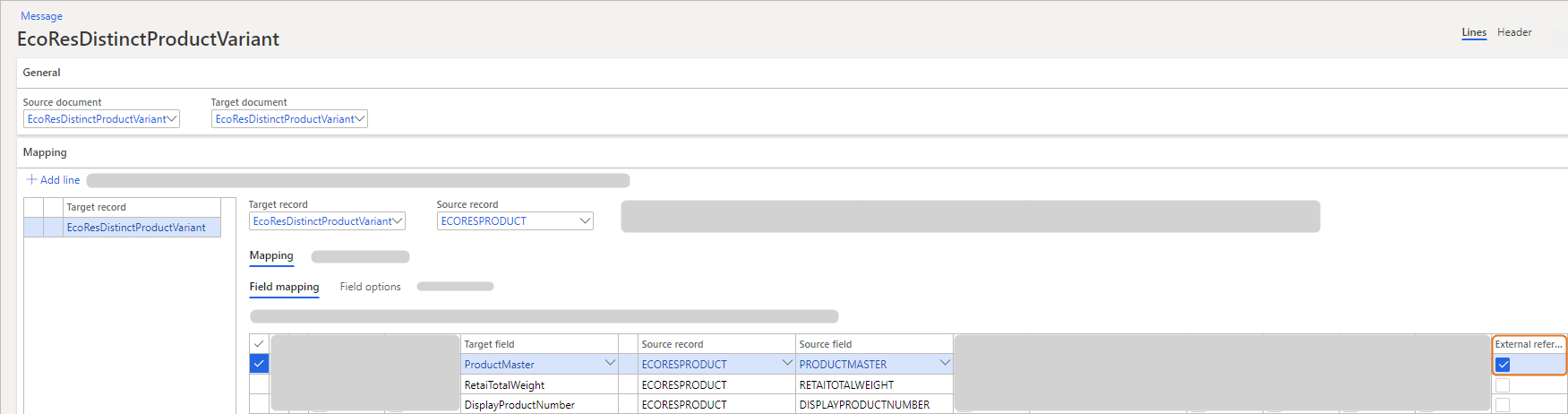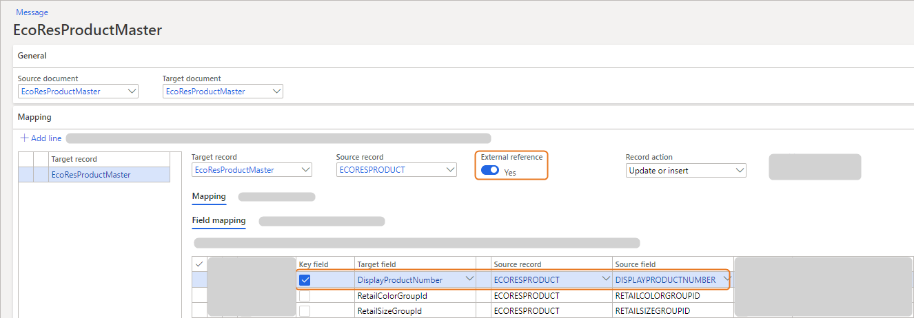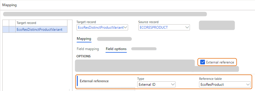 - To apply external references of the related product masters, for the EcoResDistinctProductVariant record mapping, for the ProductMaster field mapping, select the External reference check box.