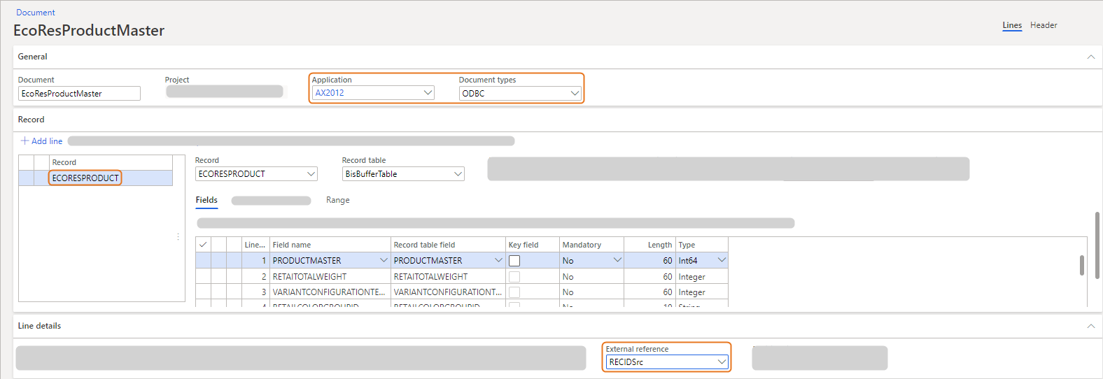 - To generate external references, for the EcoResProduct record, on the Line details, in the External reference field, select the RecIdSrc field. This field contains the unique ID of the record in AX2012.