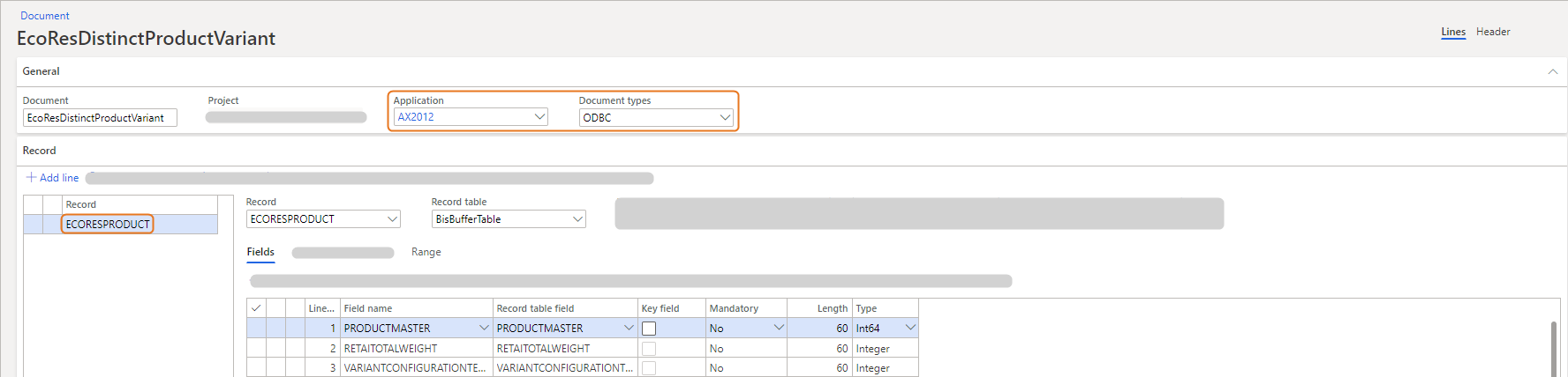 The source document record refers to the EcoResProduct table. However, you only want to migrate the product variants. Therefore, for the EcoResProduct record, define a range to limit the migration to the product variants only.