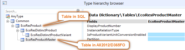 Usually, a table in AX2012 or D365 F&SCM matches one on one with a table in the database. However, in several cases, a table inheritance structure is used. This is the case for product masters and product variants.