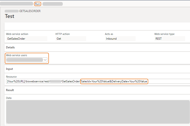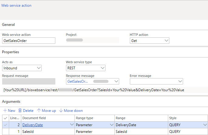 - Desired filtering in the Resource URL. The default URL is defined by the web service action setup. To define the desired filtering, in the URL, for the desired argument ('SalesId' or 'DeliveryDate'), replace 'Your Value' with the desired value filtering.